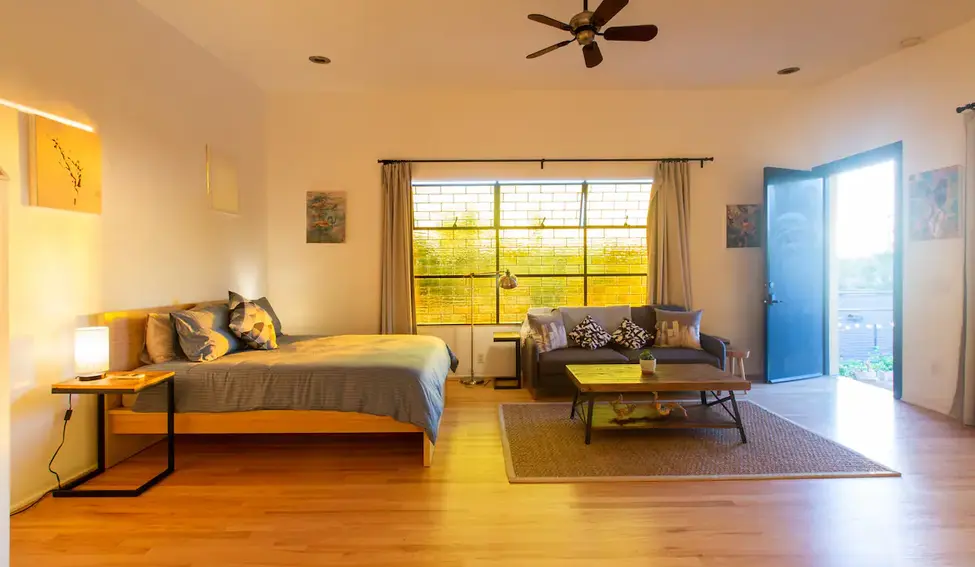 Step into this stunning guesthouse, built in 2004, and experience the perfect blend of modern design and coastal charm. With its lofted high ceilings, casement windows, subway-tiled 3/4 bath, and hardwood floors, this studio offers a breezy, stylishly designed retreat in the heart of Venice. The kitchenette provides all the essentials for your stay, while thoughtful touches and beautiful views of the palm trees create a peaceful, private oasis.