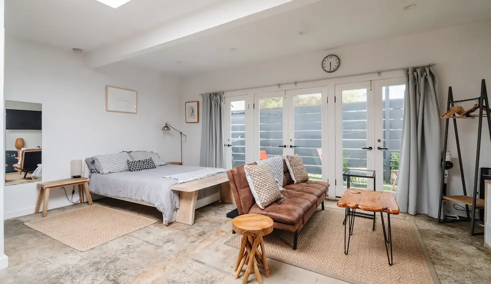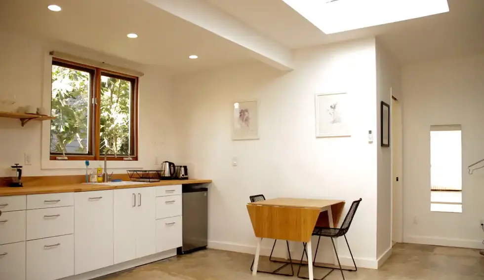 Escape to this bright, modern back house, recently renovated and thoughtfully designed in a Wabi-Sabi style. Skylights and multiple glass doors flood the space with natural light, opening onto a breezy private patio with a cozy outdoor lounge area—a perfect spot to relax and unwind.